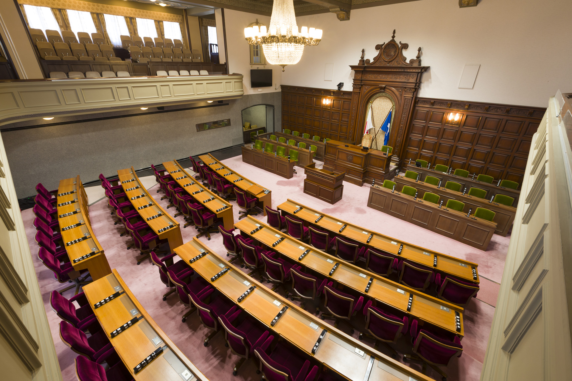 重厚感のある内装と豪華なシャンデリアやステンドグラスが特徴の議場に相応しい、
