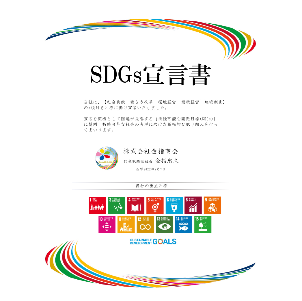 当社は、【社会貢献・働き方改革・環境経営・健康経営・地域創生】の5項目を目標に掲げ宣言いたしました。