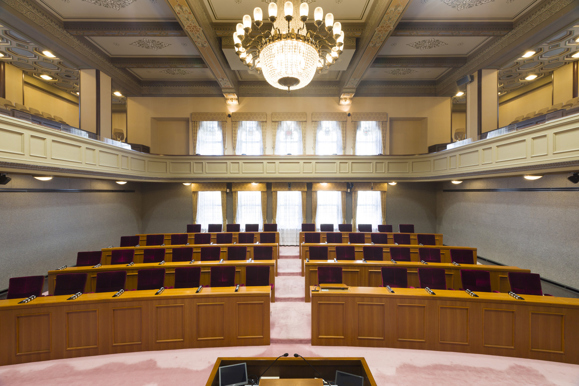 重厚感のある内装と豪華なシャンデリアやステンドグラスが特徴の議場に相応しい、